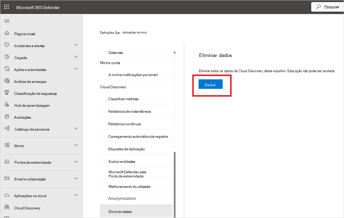 No Portal Microsoft Defender, selecione Definições>Cloud Apps>Cloud Discovery>Eliminar dados.