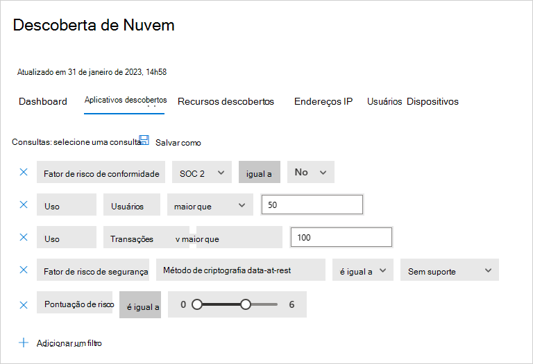 Filtre os seus dados da Cloud Discovery para gerar vistas específicas, consoante o seu interesse. Para obter mais informações, veja Filtros de aplicações detetados.