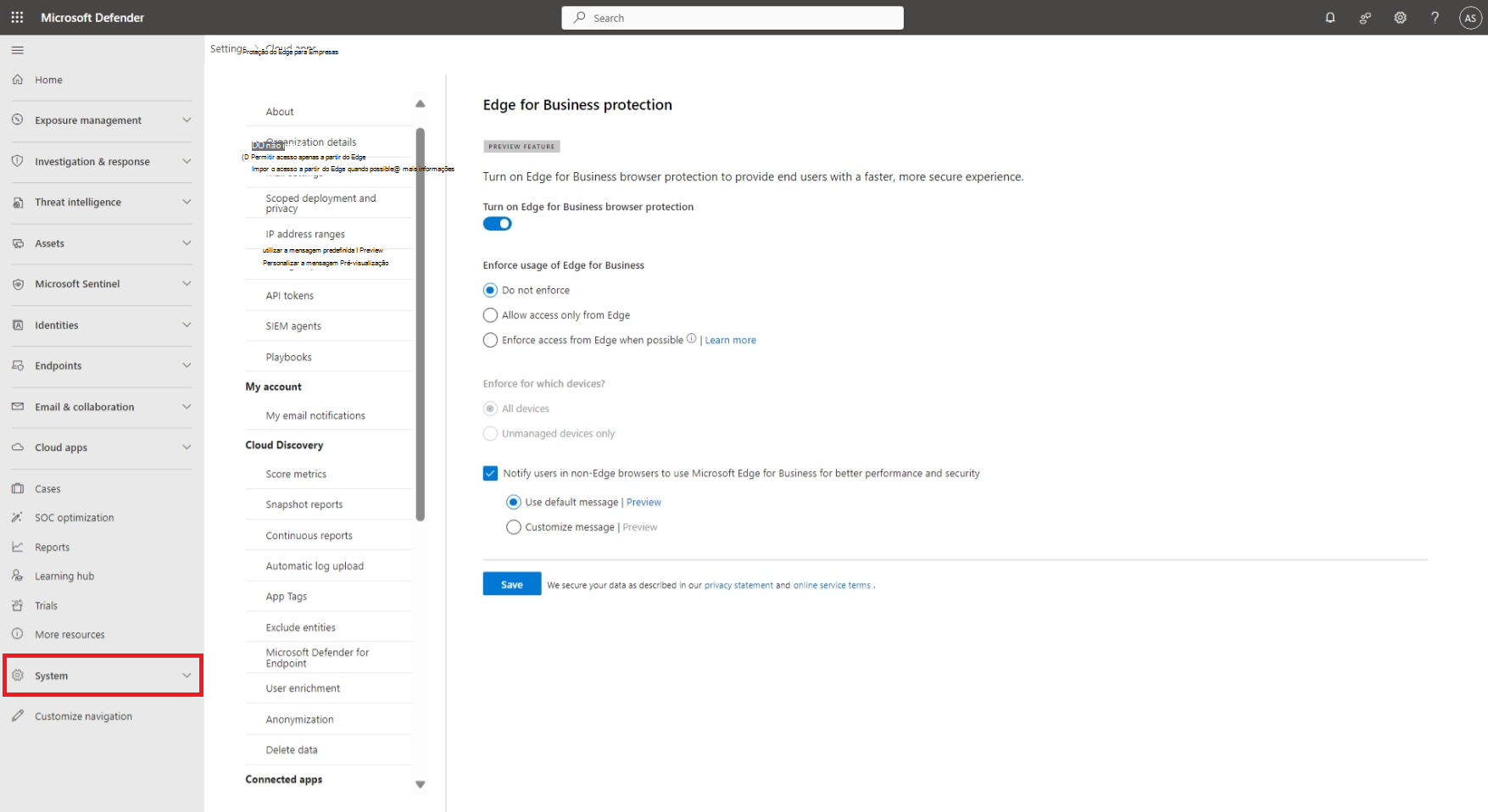 Ativar a proteção do browser Edge para Empresas: o valor predefinido é Ativado, mas pode alternar a definição para Desativado.
