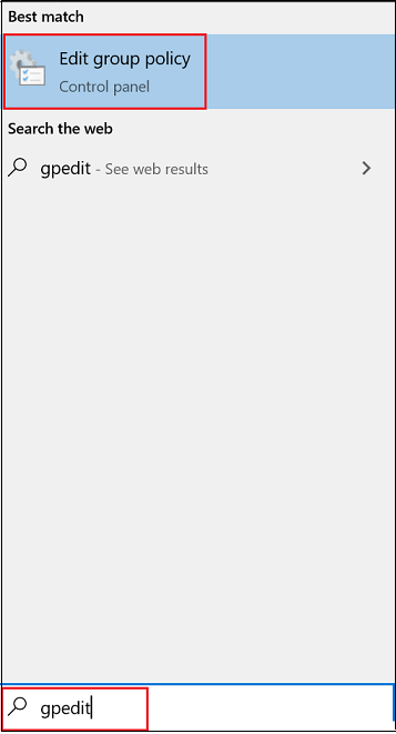 gpedit.Em Melhor correspondência, selecione Editar política de grupo para iniciar a Política de Grupo Editor Local.