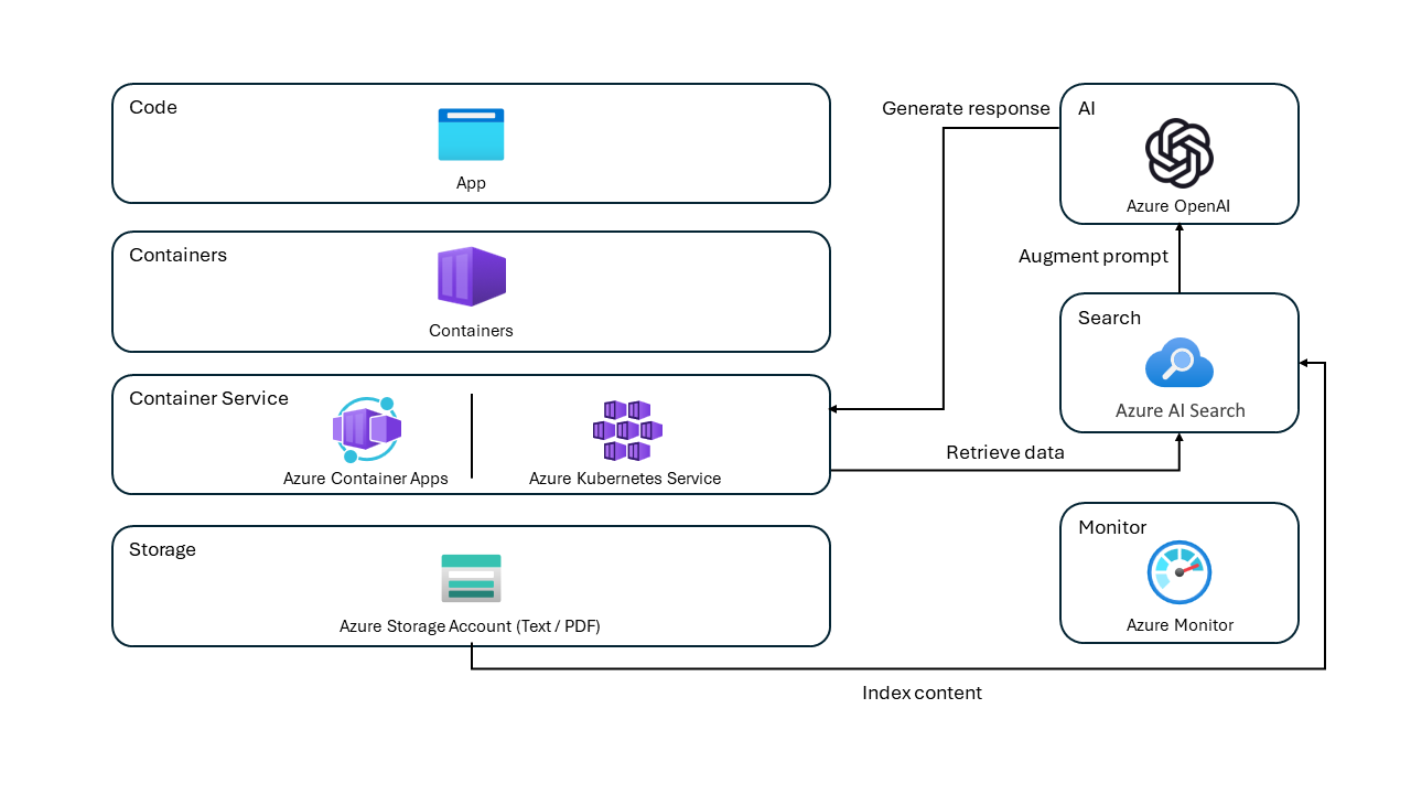 - Azure AI Search – Indexa documentos dos dados armazenados em uma Conta de Armazenamento do Azure. Isso torna os documentos pesquisáveis usando recursos de busca em vetores.