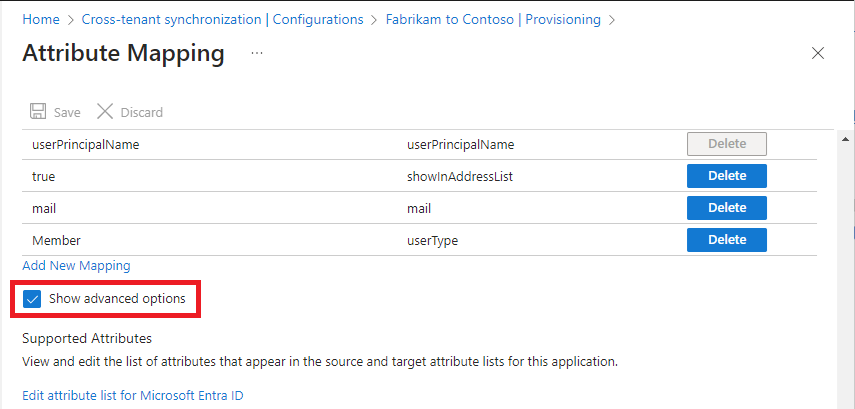 Se você criou uma extensão de diretório no locatário de origem, selecione o link Editar lista de atributos para o Microsoft Entra ID.