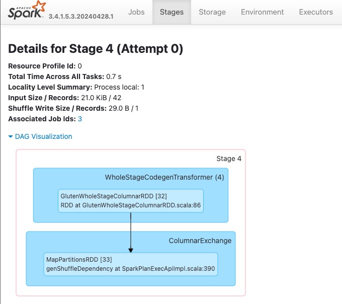Você pode navegar para a nova guia “Gluten SQL / DataFrame” para exibir as informações de build do Gluten e os detalhes de execução da consulta. A tabela Consultas fornece insights sobre o número de nós em execução no mecanismo nativo e aqueles que voltam para a JVM para cada consulta.