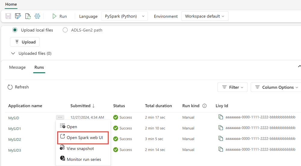 Acesse a interface do usuário do Spark ou o servidor de histórico do Spark para localizar a consulta que você precisa inspecionar. Para acessar a interface do usuário da Web do Spark, navegue até sua Definição de Trabalho do Spark e execute-a. Na guia Execuções, selecione ... ao lado do Nome do aplicativo e selecione Abrir a interface do usuário da Web do Spark. Você também pode acessar a interface do usuário do Spark na guia Monitorar no workspace. Selecione o notebook ou pipeline; na página de monitoramento, há um link direto para a Interface do usuário do Spark para trabalhos ativos.