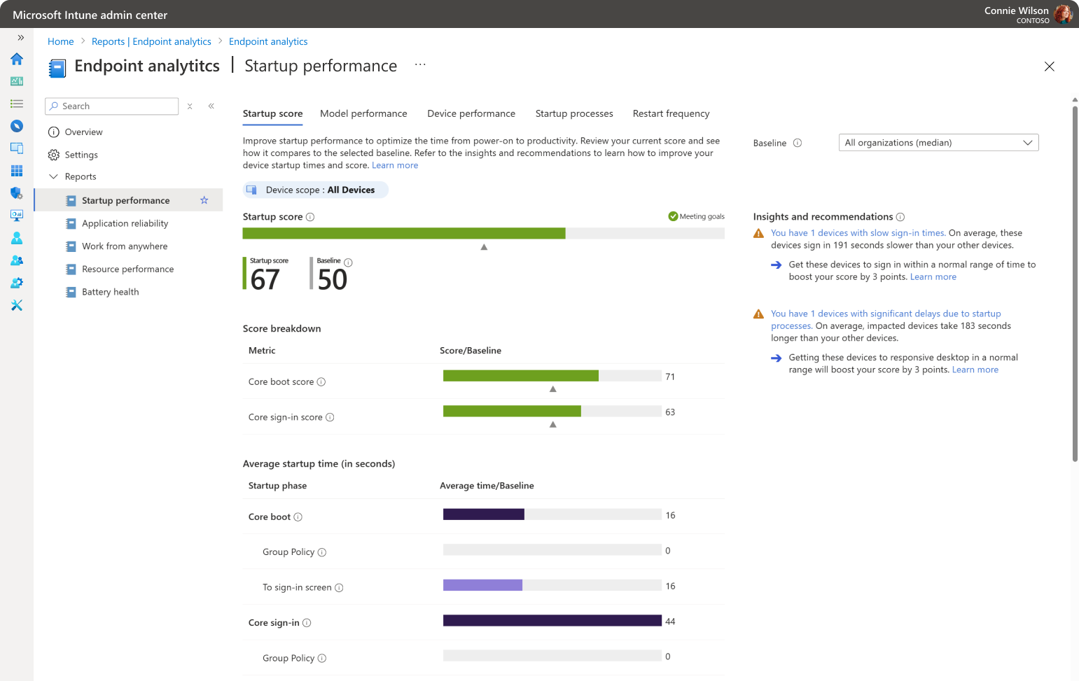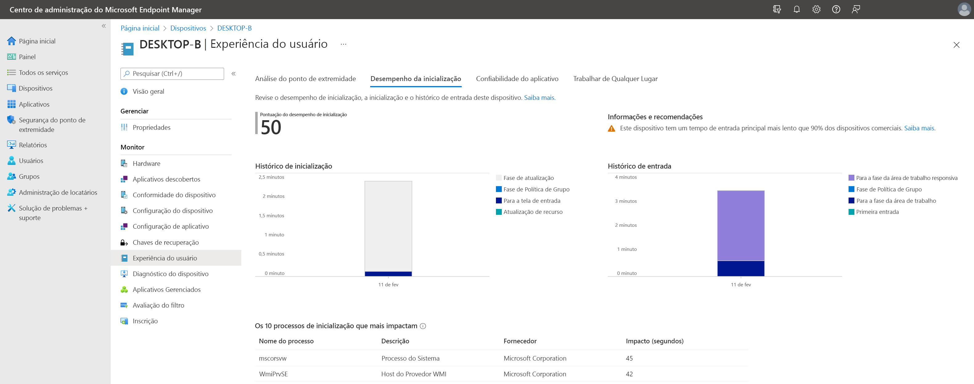As pontuações de análise de ponto de extremidade variam de 0 a 100. Notas inferiores indicam que há espaço para melhorias. As classificações ajudam-no a compreender como cada métrica afeta o seu ambiente. Por exemplo, ao analisar sua pontuação de inicialização,você descobre que, no geral, sua pontuação de 61 é maior que a linha de base de 50 para todas as organizações. Ao examinar a análise da pontuação de inicialização, você descobre que seu ambiente se destaca durante a fase de inicialização principal com uma pontuação de 77. No entanto, com base no tempo médio necessário para chegar a uma área de trabalho responsiva, você suspeita que processos de inicialização em execução longa estão rebaixando a pontuação de login principal para 46. Rever a entrada de principais informações e recomendações para a classificação de arranque confirma que os processos de execução prolongada são responsáveis pelo efeito na classificação.