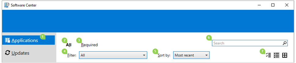 Classificar por (5): reorganizar a lista de aplicativos. Por padrão, essa lista classifica pelo Mais recente. Aplicativos disponíveis recentemente são exibidos com um novo banner que fica visível por sete dias.