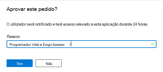 Os administradores que podem gerir pedidos de elevação podem aceitar ou rejeitar um pedido. Também podem fornecer uma razão para a sua decisão. Este motivo torna-se parte do registo de auditoria do pedido.