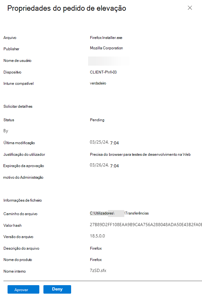 Em Pedidos de elevação, selecione o nome de um pedido de elevação para abrir o painel de propriedades Do pedido de elevação , onde pode rever os detalhes desses ficheiros.