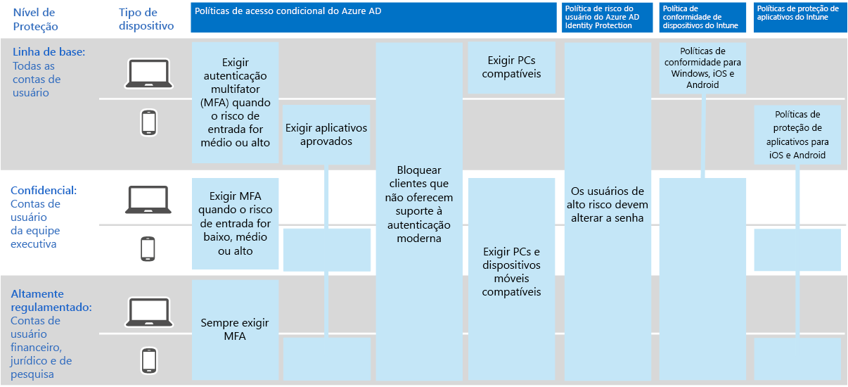 A Contoso criou um conjunto de políticas de Acesso Condicional Microsoft Entra ID e Intune para três níveis de proteção: