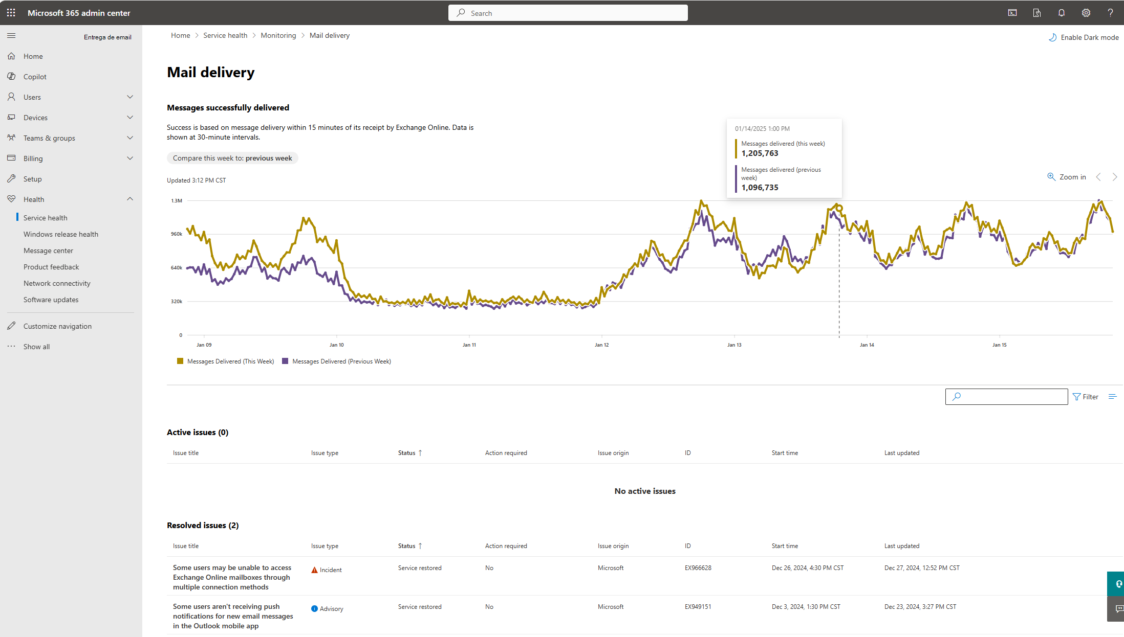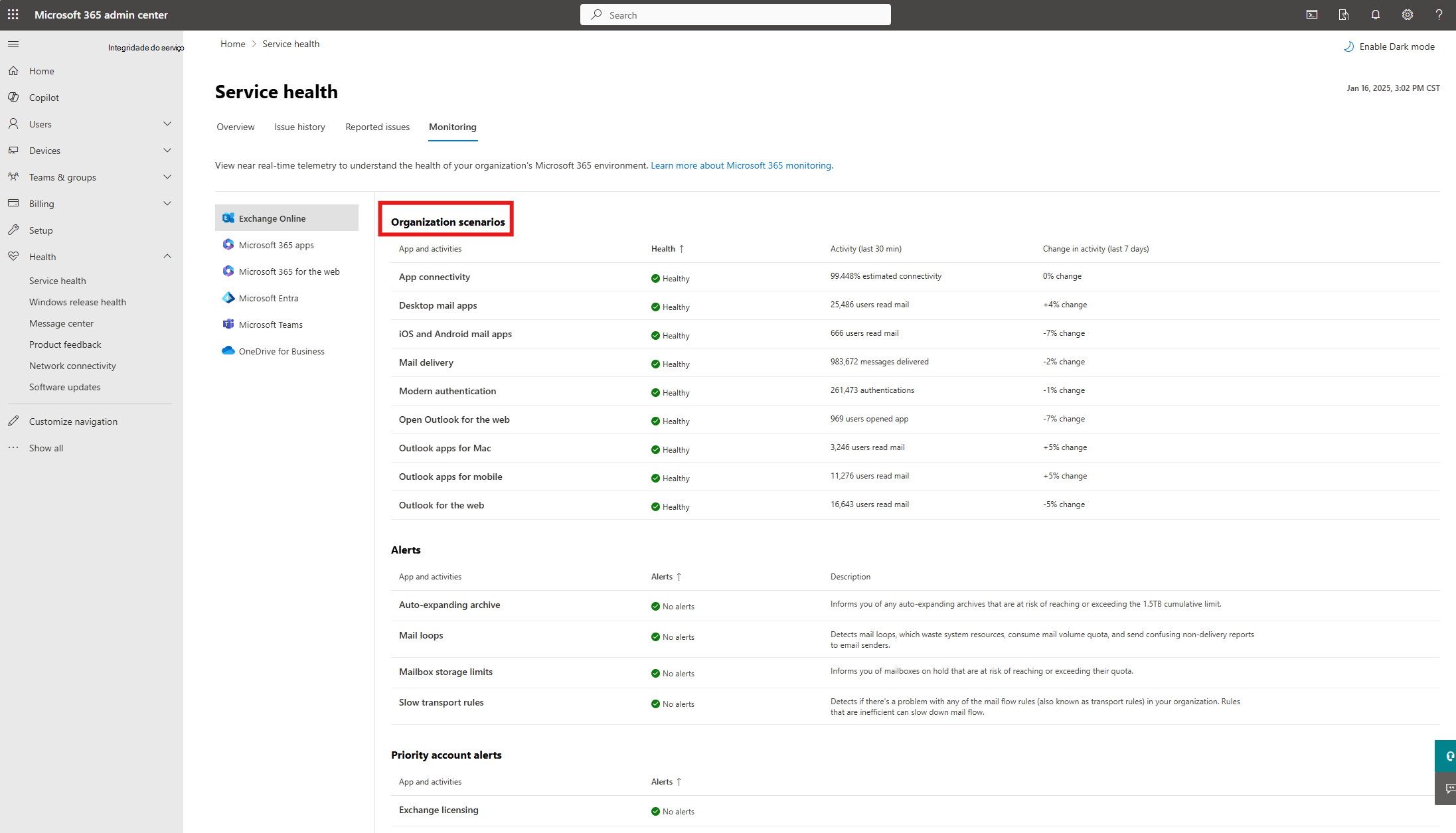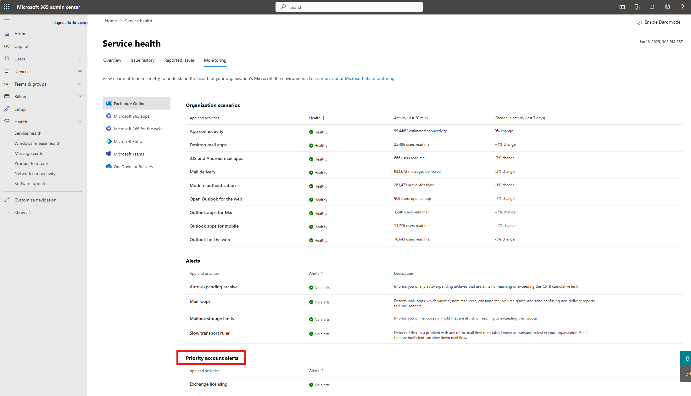 Para esses cenários, você pode ver avisos e incidentes ativos e resolvidos que afetam suas contas prioritárias. Informações identificáveis para as contas prioritárias serão exibidas nos detalhes do aviso ou incidente juntamente com as recomendações. Eis um exemplo da página na Exchange Online monitorização > do Integridade do serviço > do Estado > de Funcionamento.
