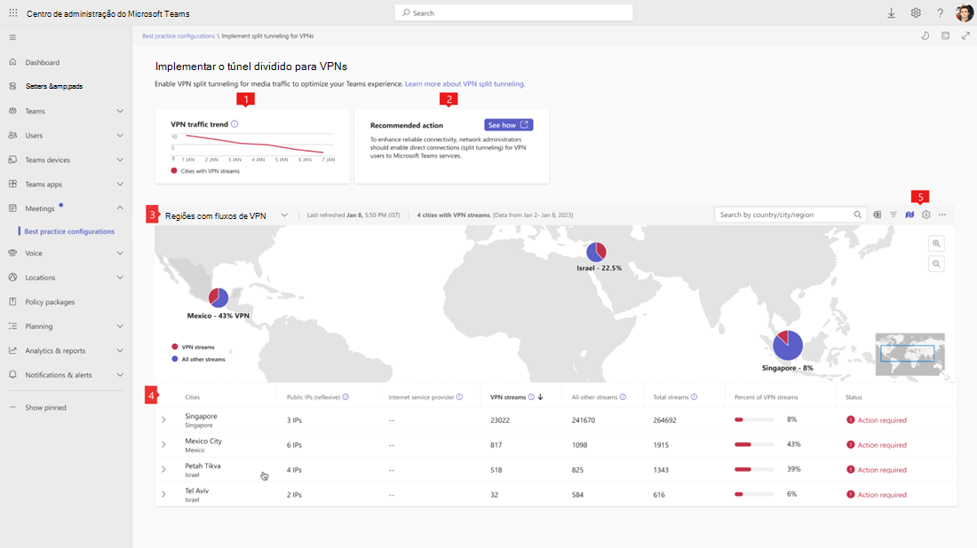 Este dashboard realça as localizações que têm uma elevada proporção de fluxos que se ligam através de uma rede privada virtual (VPN) sem túnel dividido. Para uma conectividade fiável com o Teams, deve implementar uma ligação direta para utilizadores de VPN aos serviços do Microsoft Teams. As ligações indiretas introduzem mais latências nas comunicações multimédia e podem degradar a qualidade dos suportes de dados de um utilizador. Para saber mais sobre o túnel dividido de VPN, veja Implementar o túnel de divisão de VPN para o Microsoft 365.