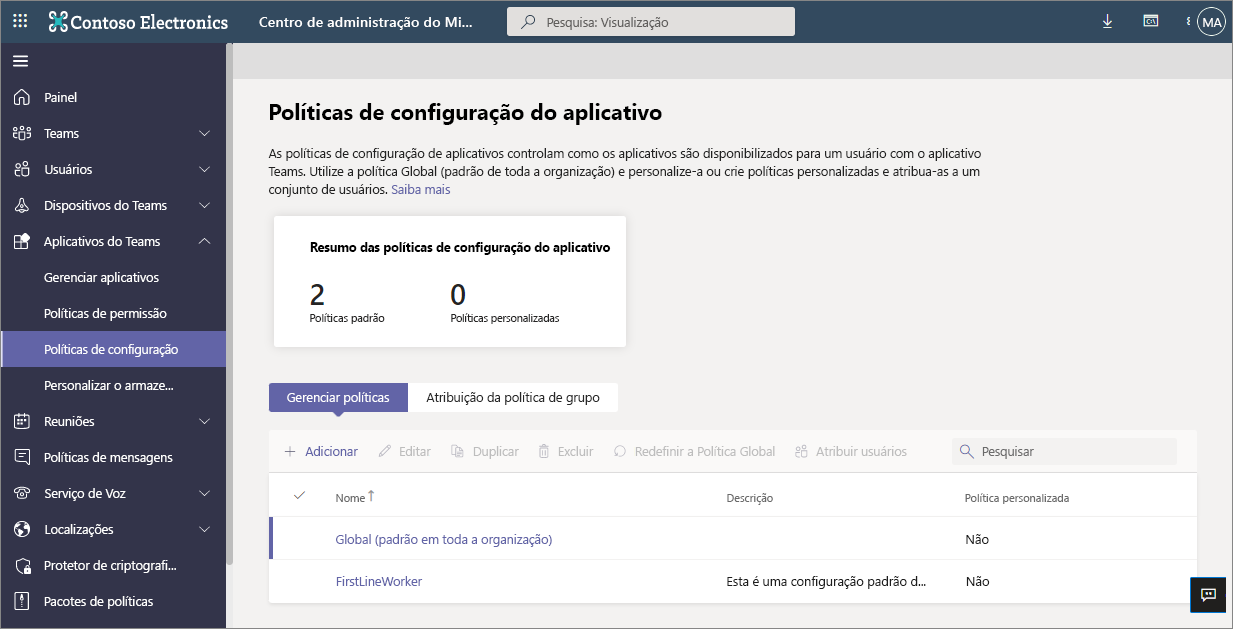 Por exemplo, uma política de configuração de aplicações pode permitir que os utilizadores carreguem aplicações personalizadas, instalem aplicações em nome dos seus utilizadores e afixem aplicações na barra de aplicações do Teams. Estas políticas estão configuradas no centro de administração do Teams.
