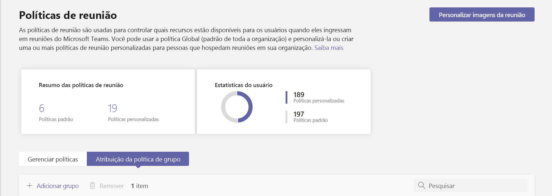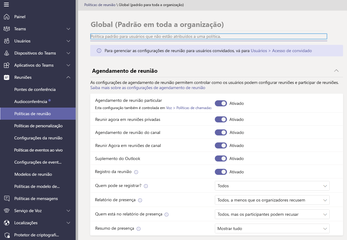 Cada política tem vários controlos que pode utilizar para escolher as opções que pretende utilizar para a sua organização. Por exemplo, as políticas de reunião permitem-lhe especificar opções de agendamento de reuniões para as pessoas na sua organização.