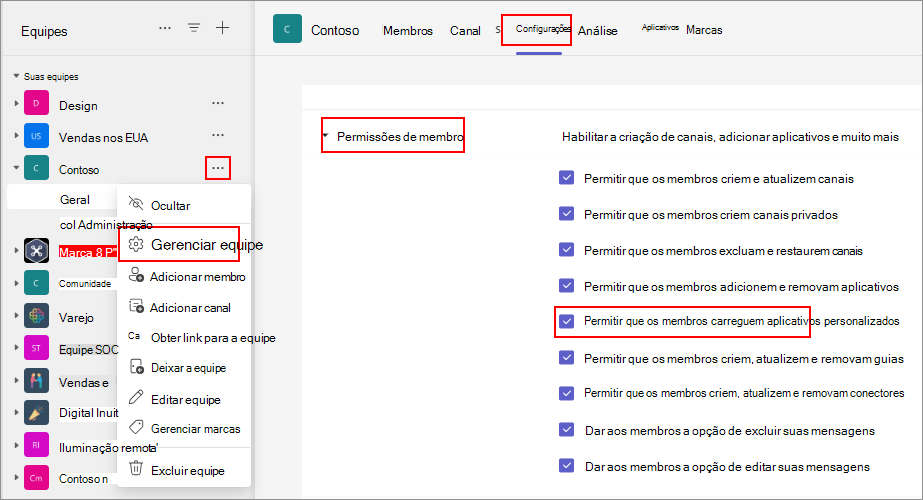 • Permitir que os membros carreguem aplicações personalizadas ao nível da equipa: esta definição em cada equipa determina se os utilizadores de uma equipa podem ou não carregar aplicações personalizadas. Os proprietários da equipa e os administradores do Teams podem modificar esta definição. Com esta definição, os proprietários de equipas podem impedir o carregamento de aplicações personalizadas para uma equipa específica, mesmo que os utilizadores possam carregar aplicações personalizadas.