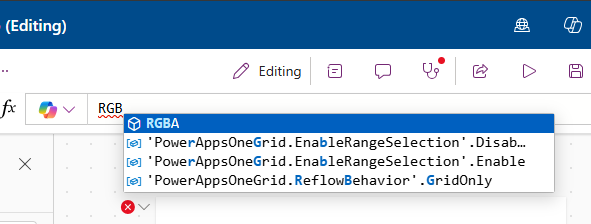 A barra de fórmulas permite adicionar, editar ou remover funções de uma propriedade do objeto selecionado. Por exemplo, selecione a tela do aplicativo para atualizar a cor de fundo usando a função RGBA.