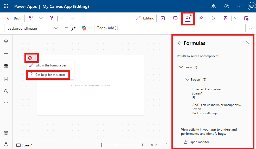 Se uma fórmula retornar um erro, você poderá exibir os detalhes do erro no Verificador de aplicativos ou diretamente da exibição do aplicativo na tela.