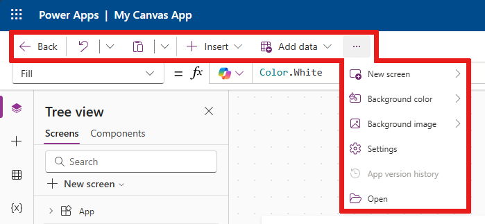 As opções do Power Apps Studio estão disponíveis na barra de comandos. As opções são relevantes para a sessão atual e as configurações relacionadas ao aplicativo.