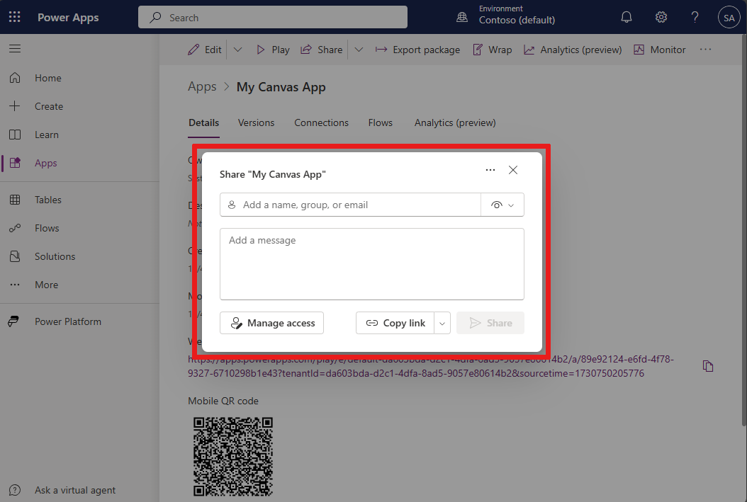 Ao selecionar a ação Compartilhar do aplicativo, você verá uma nova guia ou janela aberta em que poderá compartilhar o aplicativo. Você pode compartilhar com outros usuários ou adicioná-los como coproprietários do seu aplicativo.