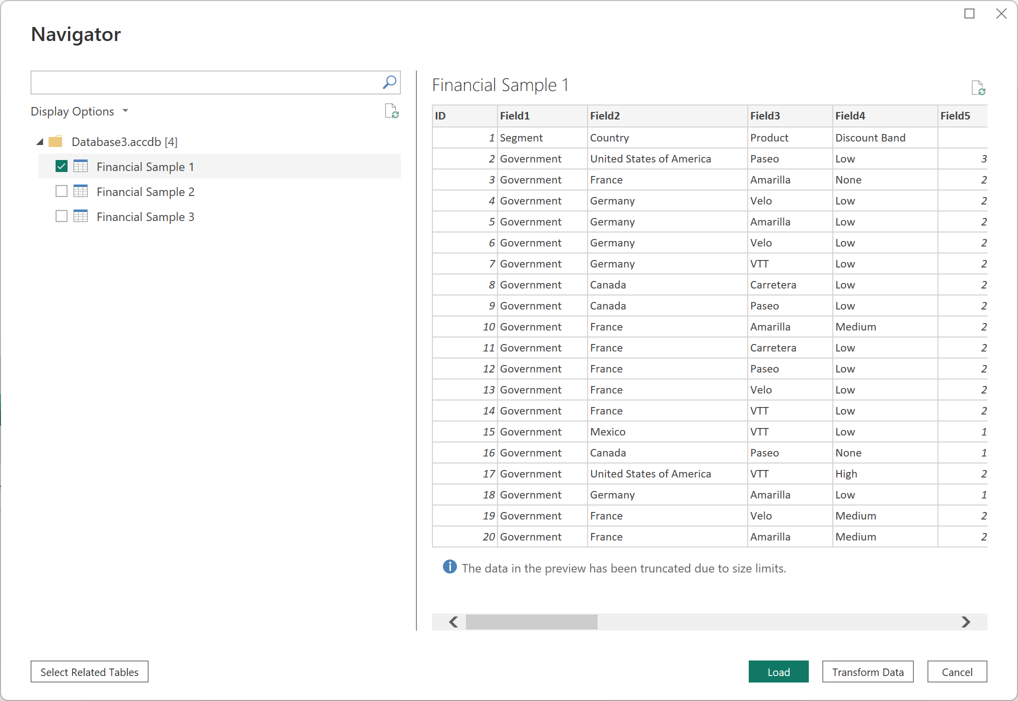 No Navegador, selecione as informações de banco de dados e selecione Carregar para carregar os dados ou Transformar Dados para continuar transformando os dados em Editor do Power Query.