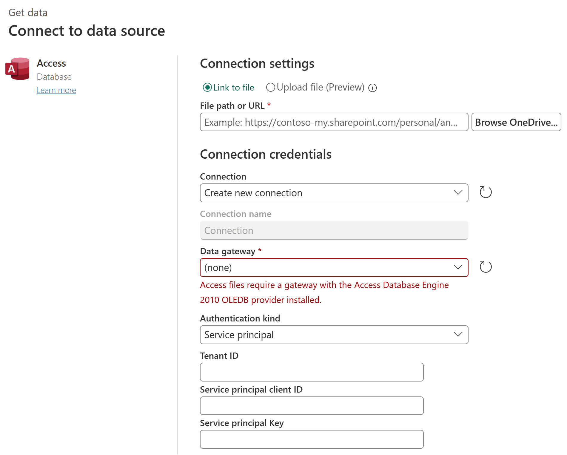 Se você estiver se conectando a um banco de dados do Access do Power Query Online, o sistema que contém o gateway de dados local deverá ter a versão de 64 bits do provedor OLEDB do Mecanismo de Banco de Dados do Access instalado.