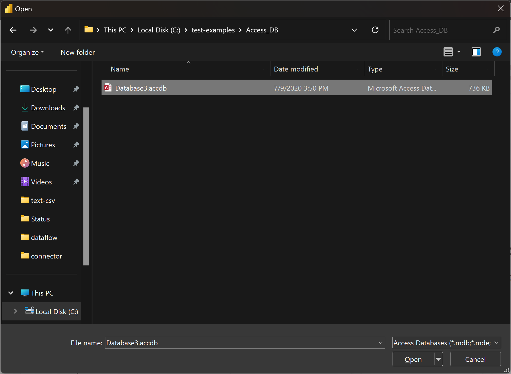 Procure e selecione o banco de dados do Access que deseja carregar. Em seguida, selecione Abrir.