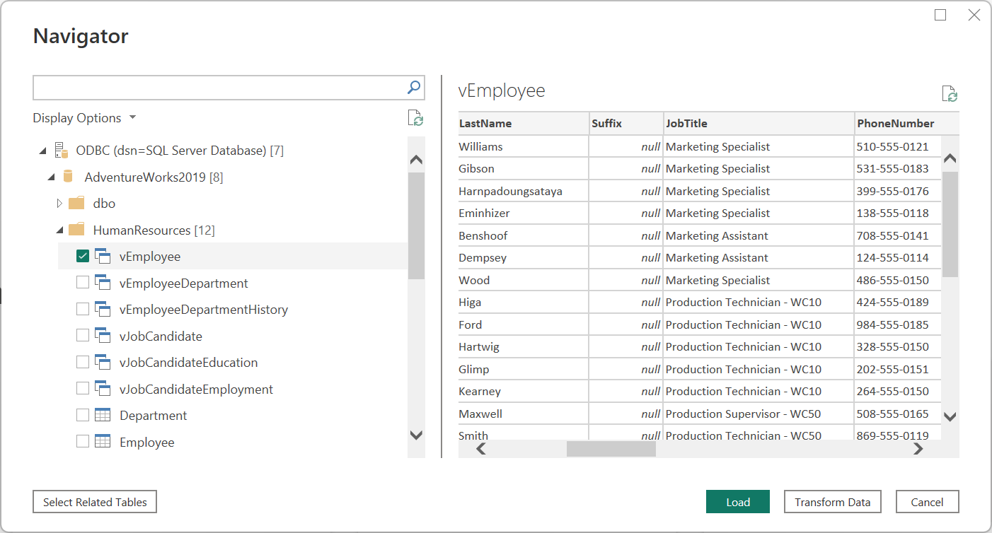 No Navegador, selecione as informações de banco de dados desejadas e selecione Carregar para carregar os dados ou Transformar Dados para continuar transformando os dados no editor do Power Query.
