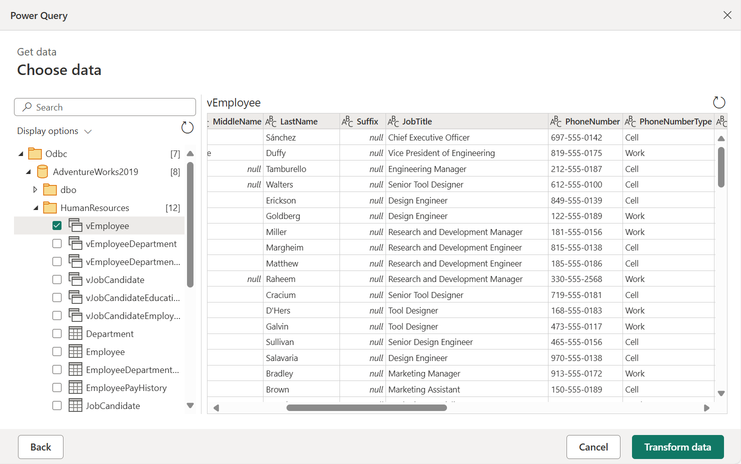 No Navegador, selecione as informações de banco de dados desejadas e selecione Transformar dados para continuar transformando os dados no editor do Power Query.