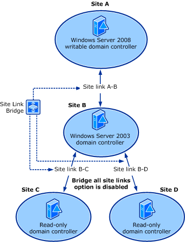 For most existing branch office deployments that use Windows Server 2003 ___domain controllers, however, the Bridge all site links option is disabled. If you are adding RODCs to an existing deployment where Bridge all site links option is disabled, consider how RODC replication will work if you cannot place a writable Windows Server 2008 ___domain controller in the nearest site.