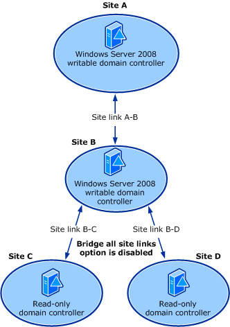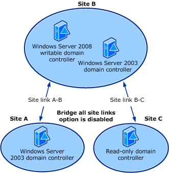 In the following illustration, Sites A, B, and C have site links A–B and B–C and the Bridge all site links option is disabled. In this example, there are Windows Server 2003 ___domain controllers in Site A and Site B, and there is an RODC in Site C.