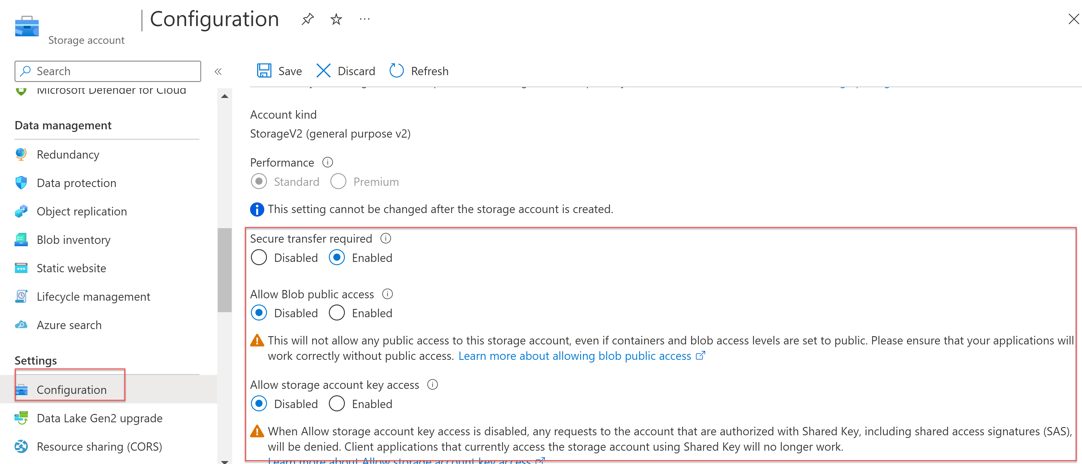 Essa configuração é habilitada por padrão quando você implanta uma nova conta de armazenamento do Azure (segura por padrão).