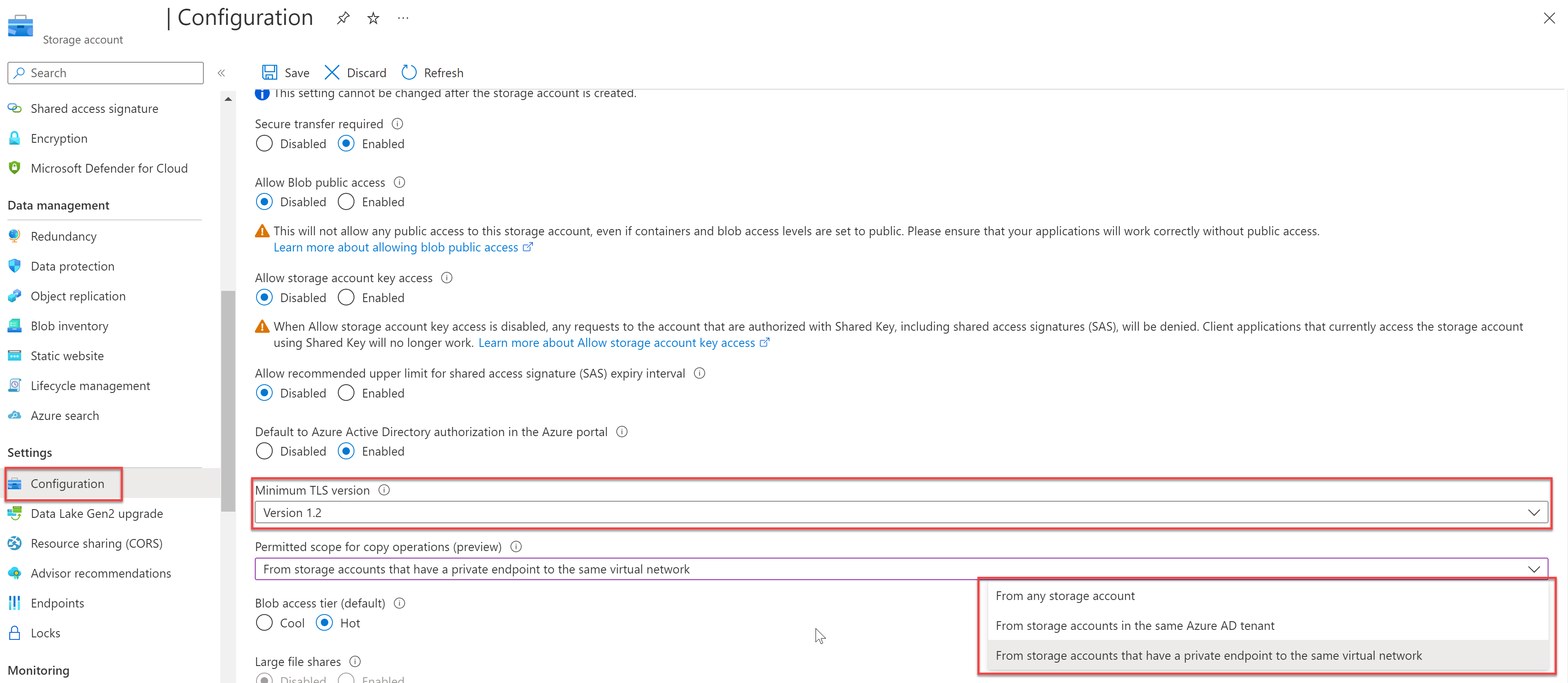 Defina o escopo das operações de cópia para restringir essas operações somente àquelas das contas de armazenamento de origem que estejam no mesmo locatário do Microsoft Entra ou que tenham um link privado para a mesma VNet (rede virtual) que a conta de armazenamento de destino.