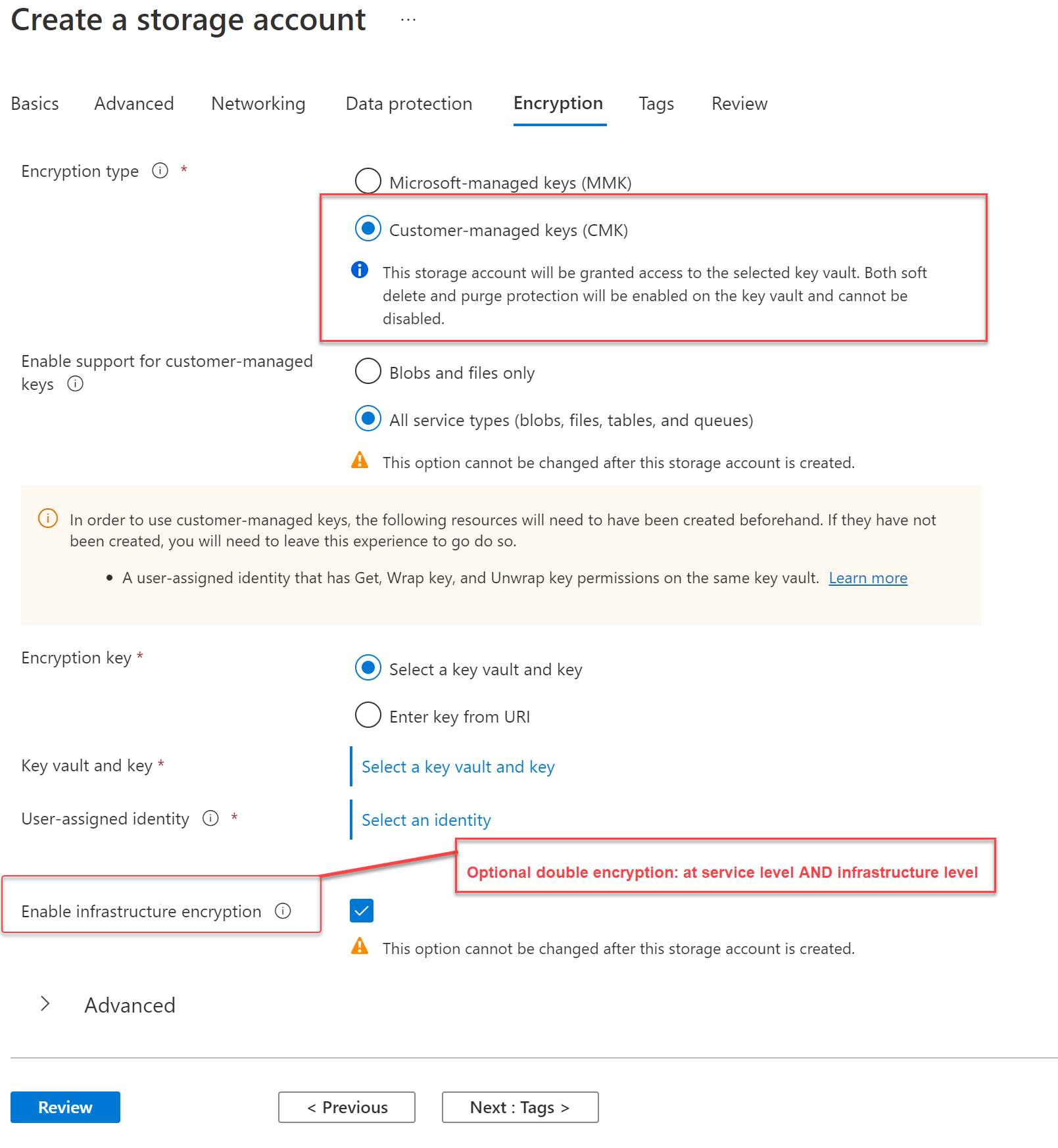Para utilizar uma chave gerenciada pelo cliente para criptografia de conta de armazenamento, você deve habilitá-la durante a criação da conta e deve ter um cofre de chaves com chave e identidade gerenciada com permissões apropriadas já provisionadas. Opcionalmente, você pode habilitar a criptografia AES de 256 bits no nível da infraestrutura do armazenamento do Azure.