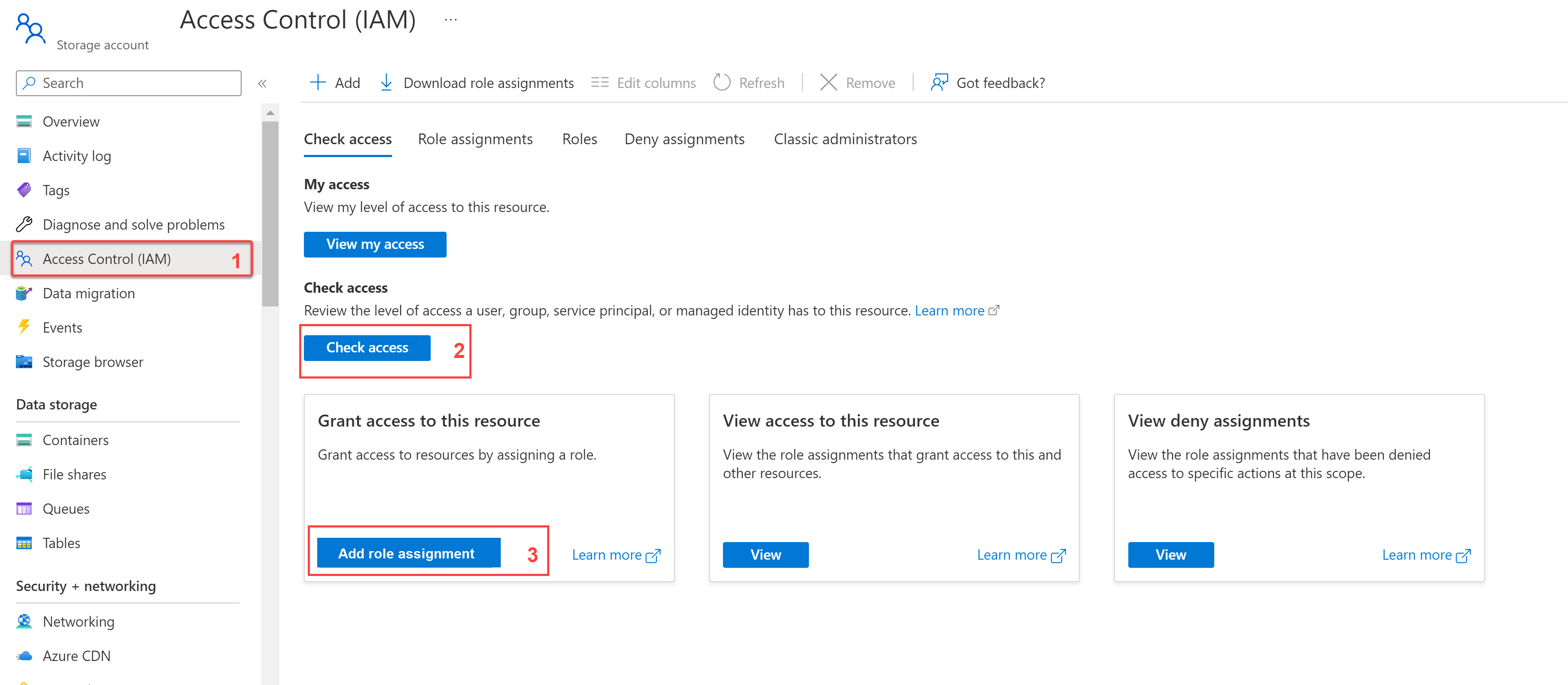 Você configura o controle de acesso a partir das configurações de controle de acesso (IAM) de uma conta de armazenamento, conforme mostrado aqui.