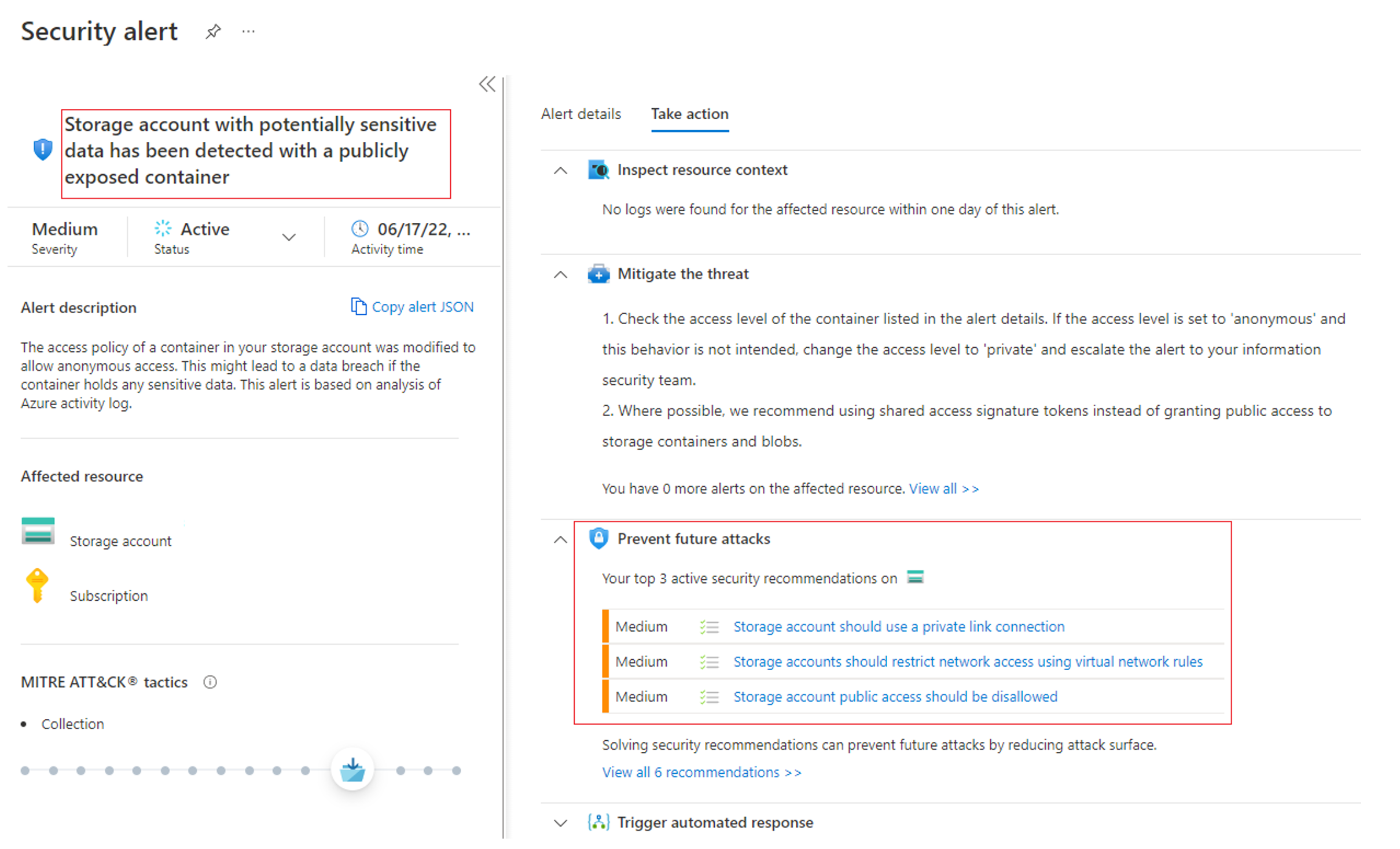 Veja um exemplo de alerta de segurança para uma conta de armazenamento com uma descrição do alerta e das medidas de prevenção realçadas.