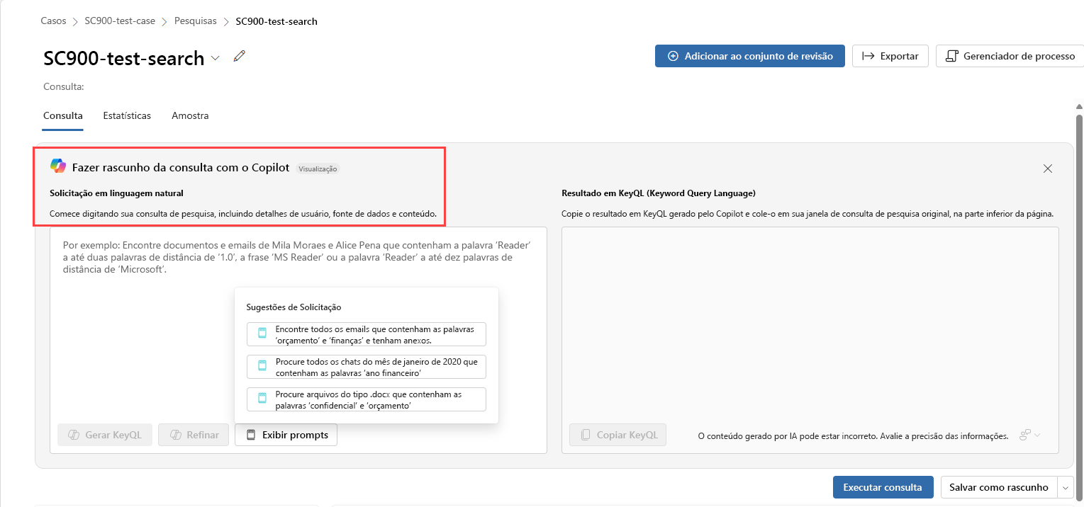 Com a integração do Copilot à Descoberta Eletrônica, os gerentes de Descoberta Eletrônica podem usar prompts em linguagem natural para gerar consultas KeyQL. Após a consulta ser gerada, você pode salvá-la ou executar a consulta. O Copilot também fornece sugestões de prompt que podem ser geradas para uma consulta.