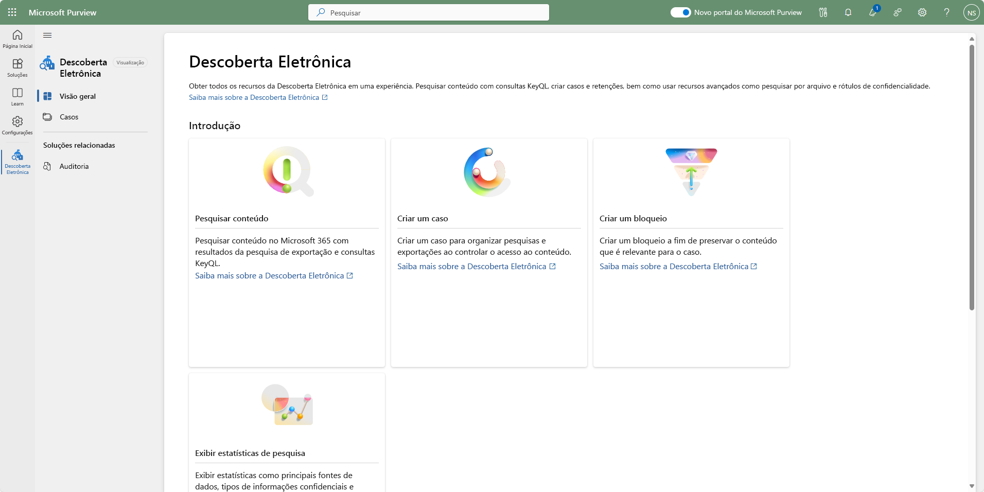 O portal do Microsoft Purview apresenta uma experiência unificada de interface do usuário para Descoberta Eletrônica. Se você trabalhou anteriormente com a Descoberta Eletrônica por meio do portal de conformidade do Microsoft Purview, uma diferença crucial é que você não verá mais uma interface do usuário diferente para Descoberta Eletrônica (Padrão) e Descoberta Eletrônica (Premium). Em vez disso, você terá uma interface do usuário consistente e, dependendo do licenciamento e das assinaturas da sua organização, poderá gerenciar mais casos e analisar mais conteúdo usando recursos de Descoberta Eletrônica Premium.