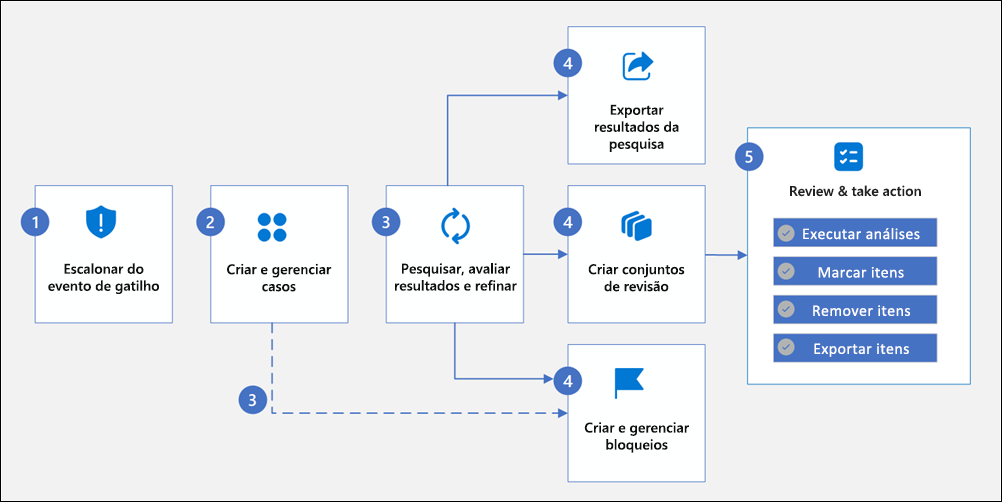 O fluxo de trabalho da Descoberta Eletrônica ajuda você a identificar, investigar e tomar medidas mais rapidamente sobre as ESI (informações eletrônicas armazenadas) na sua organização. Para identificar e tomar medidas em itens de ESI com a Descoberta Eletrônica (versão prévia), o seguinte fluxo de trabalho é usado: