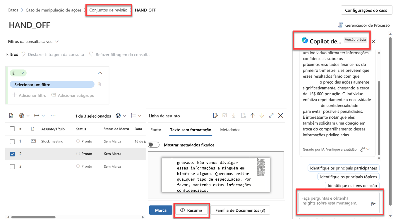 - Obter resumo contextual das evidências coletadas em conjuntos de revisão de Descoberta Eletrônica (Versão prévia).