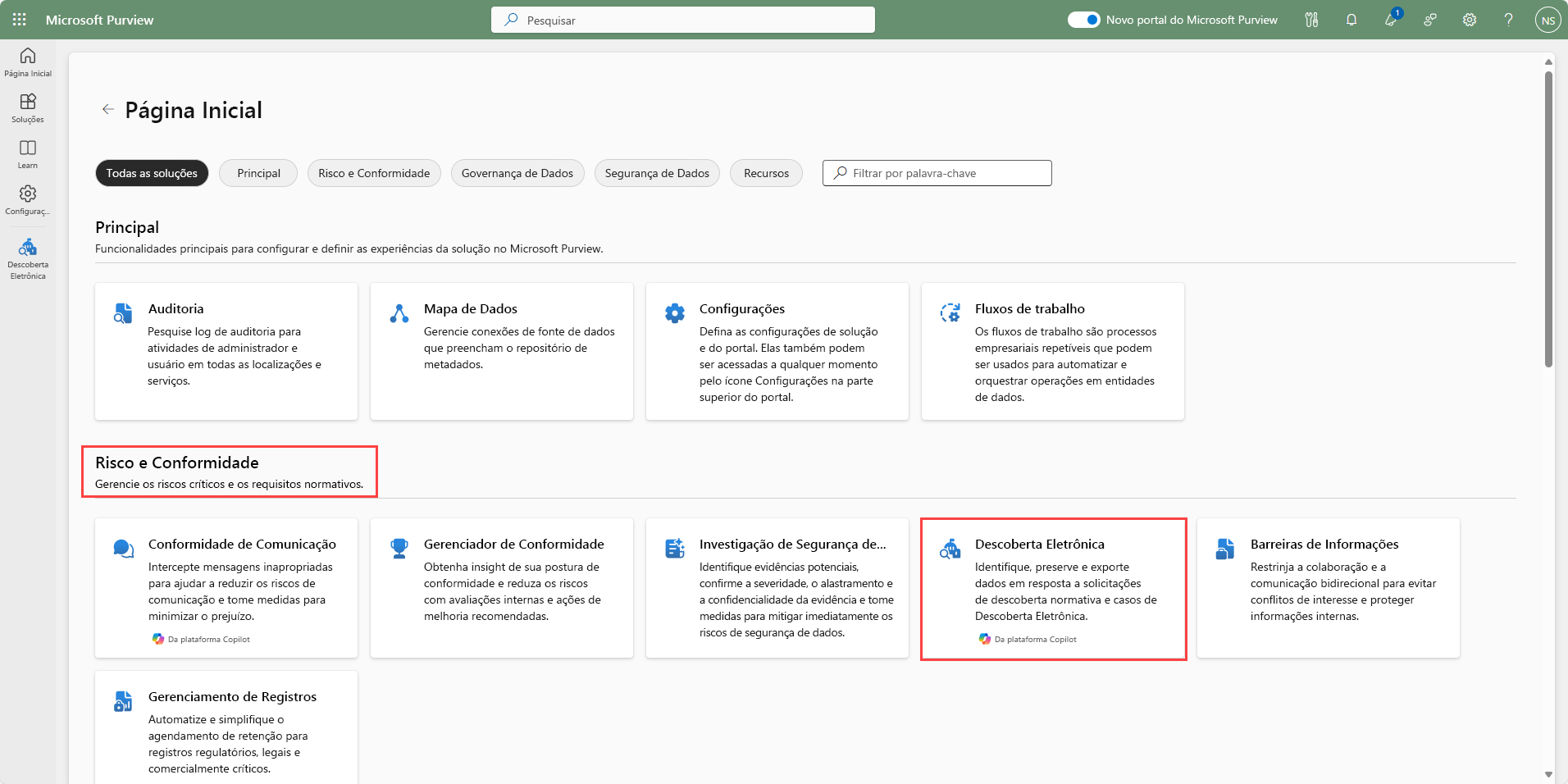 A Descoberta Eletrônica é uma das soluções disponíveis por meio do portal do Microsoft Purview, no conjunto de soluções de Risco & Conformidade.