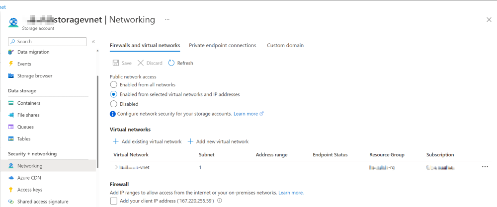 Navegue até a conta de armazenamento e selecione Rede. Na configuração Firewalls e redes virtuais, selecione Habilitar de redes virtuais e endereços IP selecionados para Acesso à rede pública. Adicione a sub-rede do pool do Lote na lista de permissões do firewall.