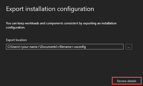 Confirme o local onde você deseja salvar o arquivo .vsconfig e escolha Revisar detalhes.