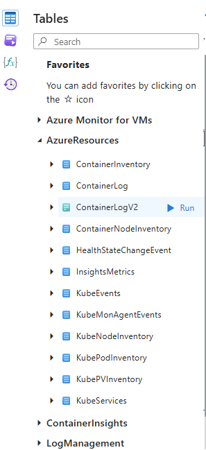 No portal do Azure, selecione Monitor>Logs>Tabelas.