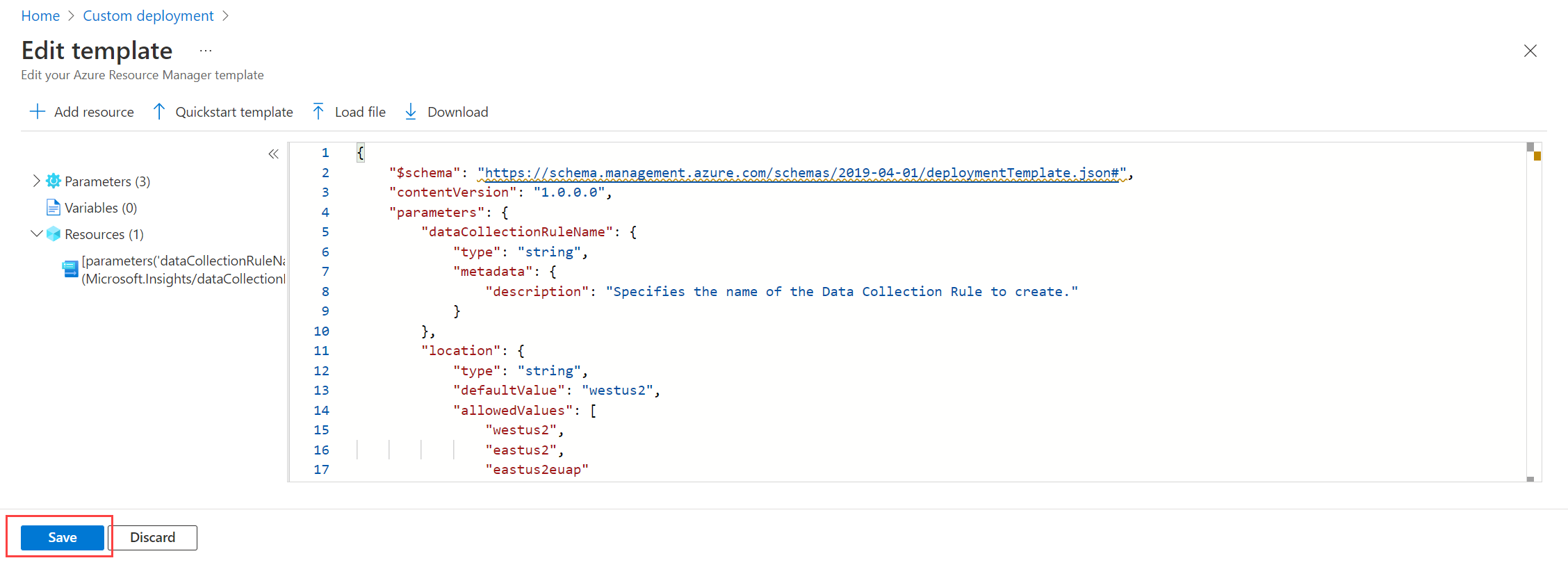 Cole o seguinte modelo do Gerenciador de Recursos no editor e selecione Salvar.