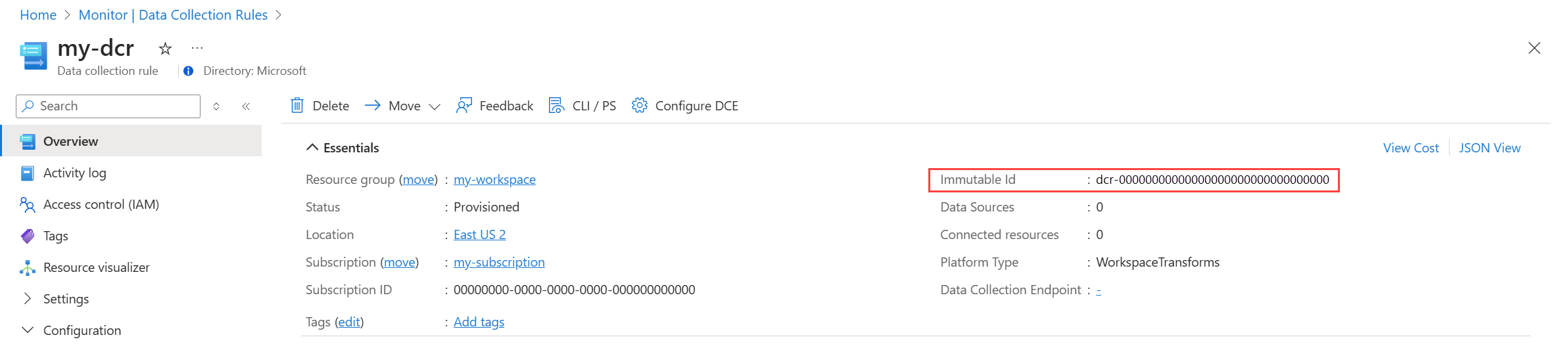 é gerado para o DCR quando ele é criado. Você pode recuperá-lo na página Visão geral do DCR no portal do Azure.