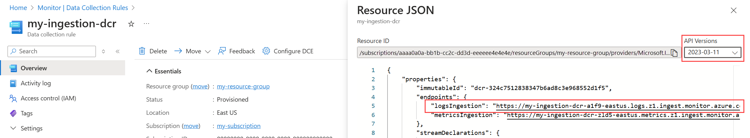 O ponto de extremidade de ingestão de logs de DCR é gerado quando você cria um DCR para ingestão direta. Para recuperar este ponto de extremidade, abra o DCR na visualização JSON no portal do Azure. Talvez seja necessário alterar a versão da API para a versão mais recente para que os pontos de extremidade sejam exibidos.