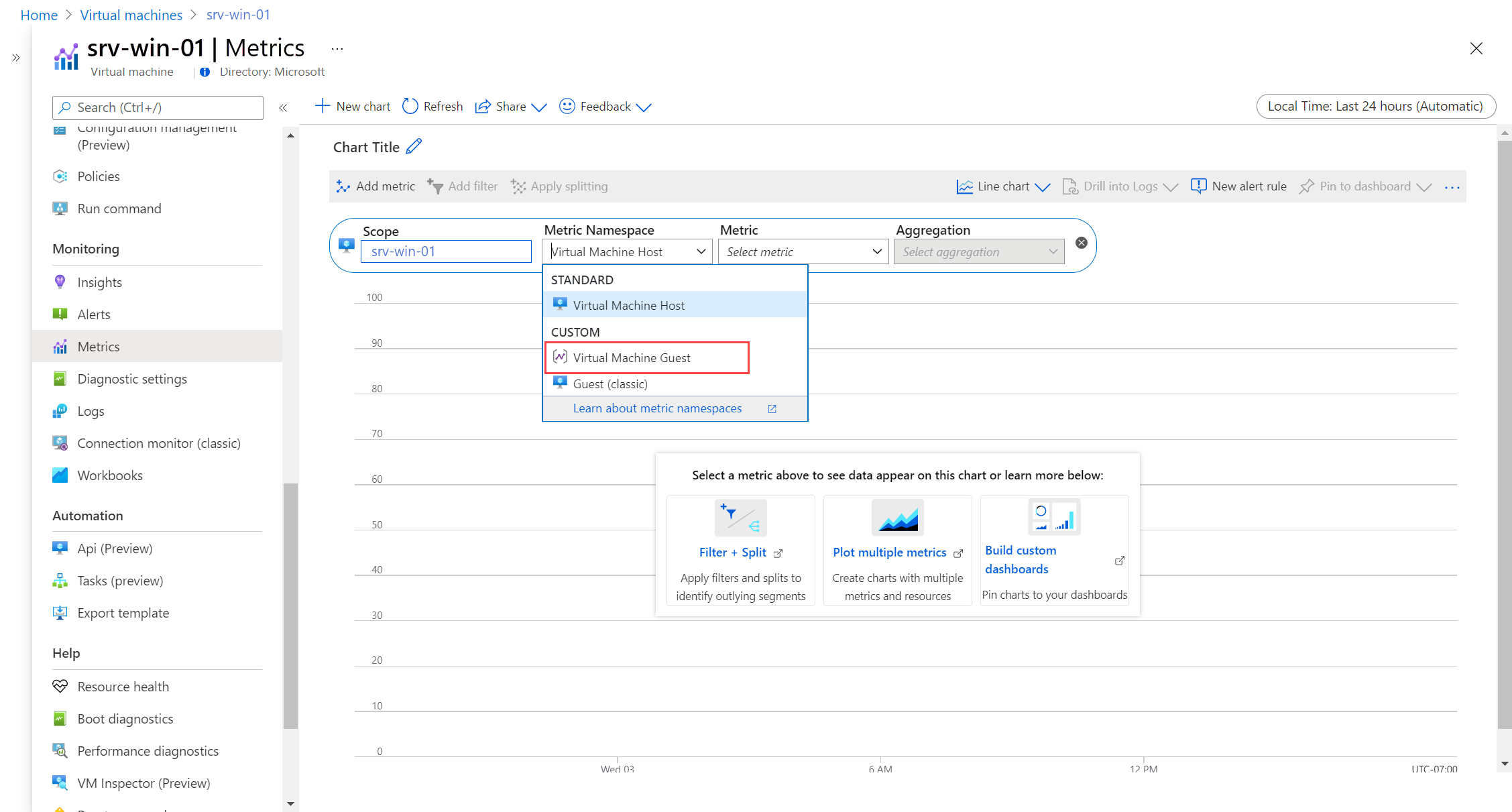 Selecione Métricas no menu da máquina virtual. O explorador de métricas é aberto com o escopo definido para sua máquina virtual. Selecione Metric Namespace>Virtual Machine Guest.