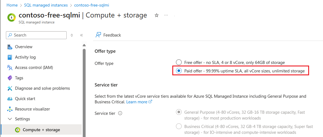 Para usar uma Instância Gerenciada SQL do Azure paga ilimitada ou se você ficar sem horas de vCore, atualize sua instância gratuita para uma instância paga diretamente do portal do Azure.