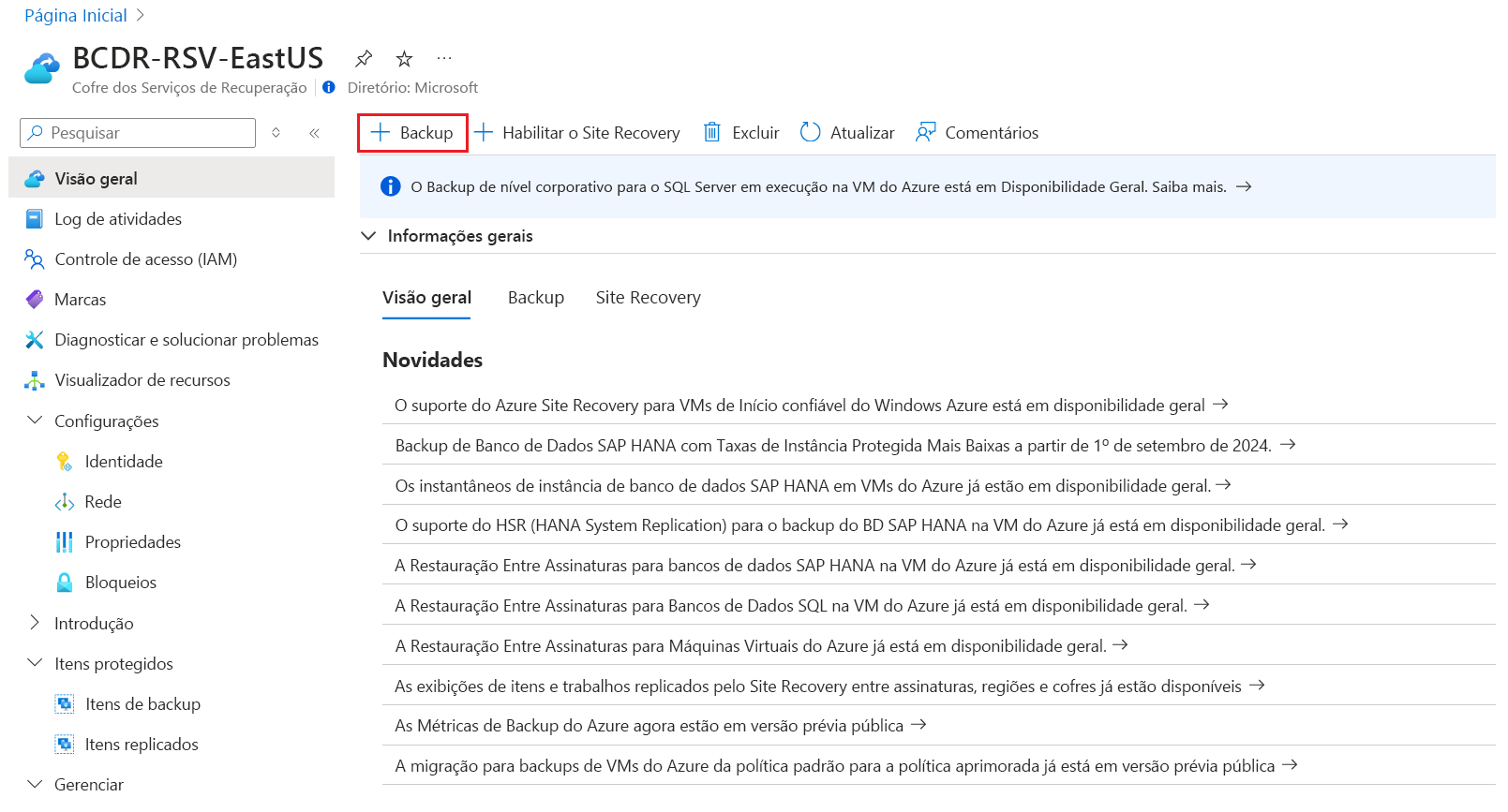 No portal do Azure, vá para o cofre dos Serviços de Recuperação e selecione +Backup.