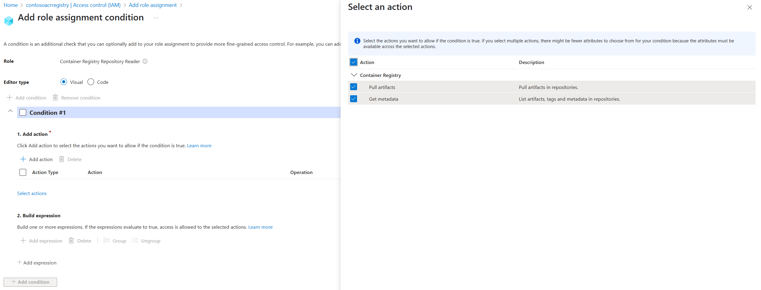 Se você atribuir uma função habilitada para ABAC sem condições ABAC, a atribuição de função não terá escopo para repositórios. Isso significa que uma atribuição de função sem condições ABAC será tratada como uma atribuição de função em todo o Registro, concedendo permissões a todos os repositórios no Registro. Para definir o escopo de uma atribuição de função a repositórios específicos, você deve incluir condições ABAC ao atribuir uma função habilitada para ABAC.