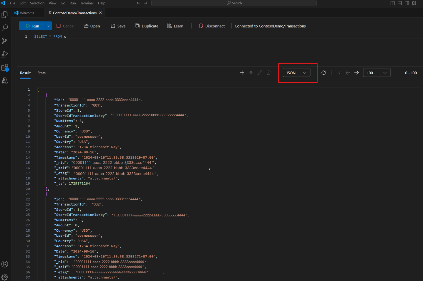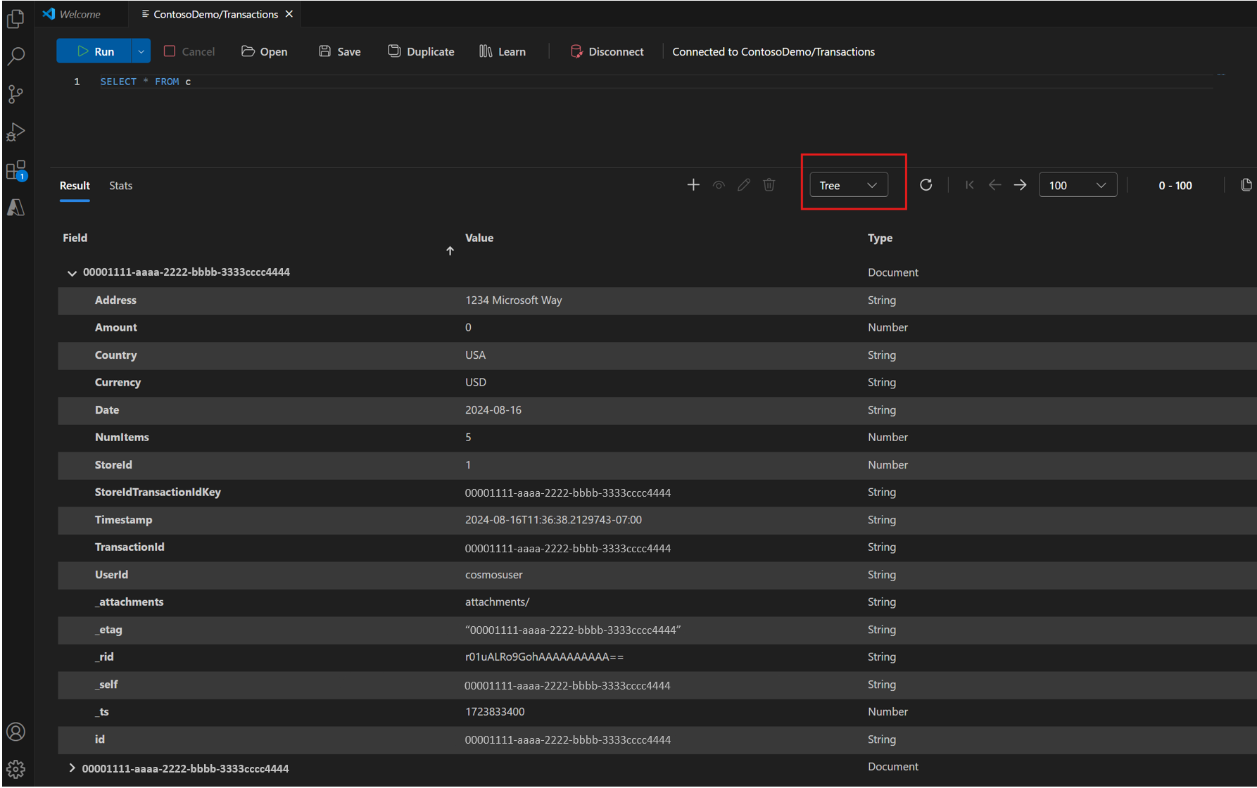 Resultados instantâneos: visualize imediatamente os resultados da consulta no formato de sua preferência: modo de exibição de tabela, JSON ou árvore.